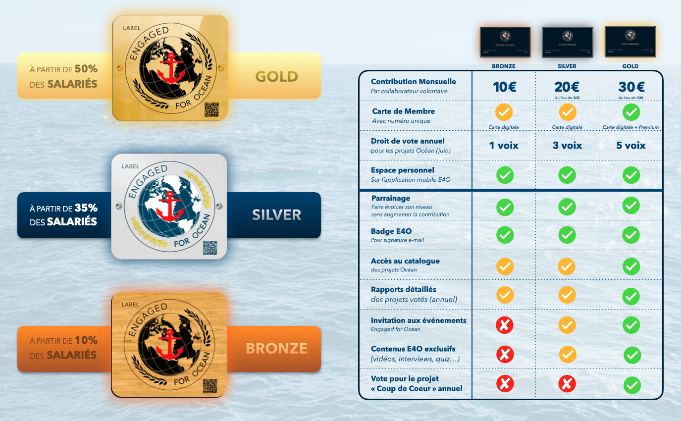 Un espace personnel sur l'application mobile Engaged For Ocean (iOS & Android), une carte digitale ou métal (gold), un accès aux avantages E4O (notamment, dans un futur proche, un réseau d'entreprise offrant des avantages concrets partout dans le monde) et un suivi clair de votre impact.